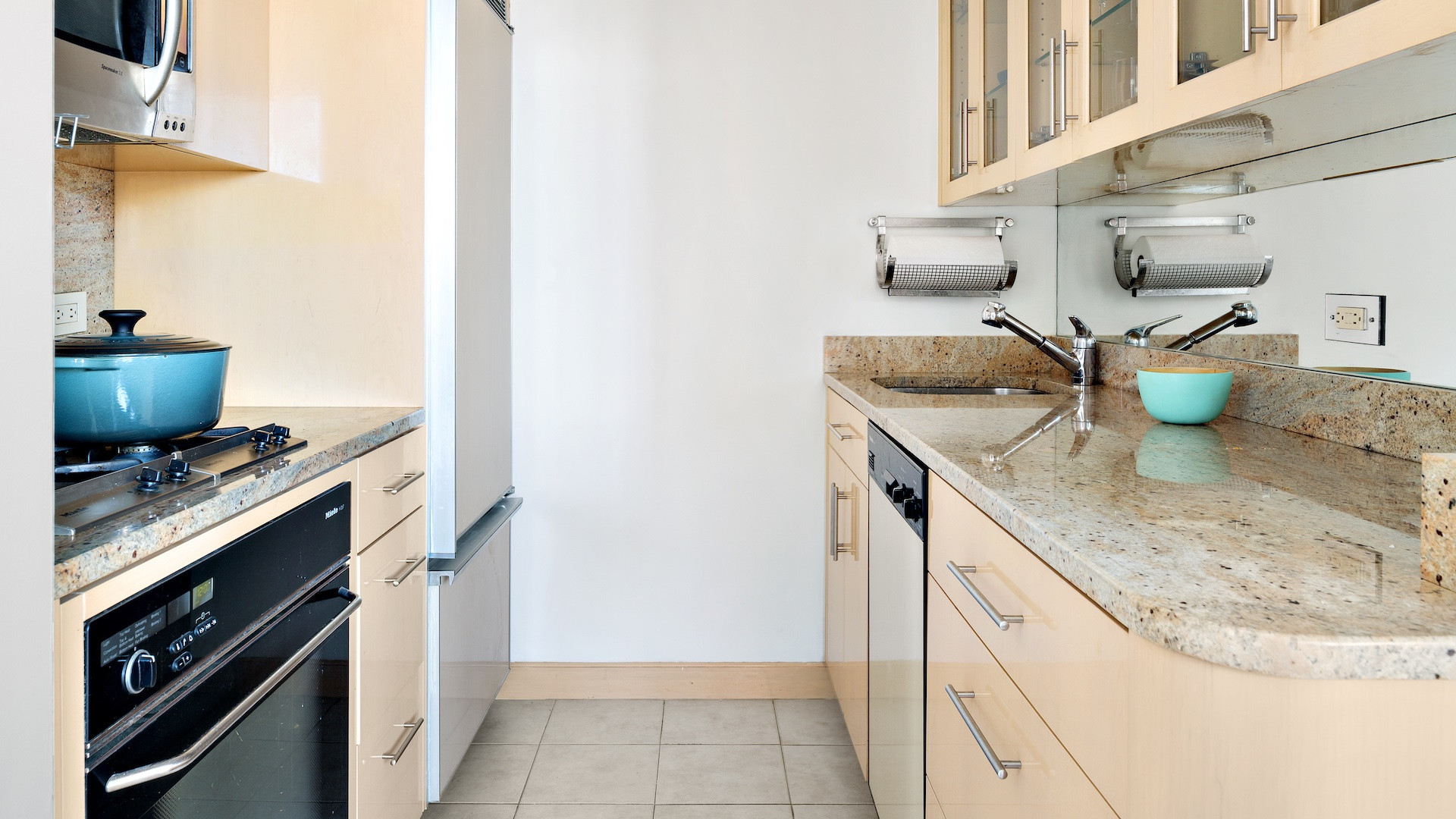 The kitchen was remodeled by the renowned residential design firm, Fishelberg and Company. Included are a Sub-Zero refrigerator, Miele oven and stovetop, and a deep Franke sink.